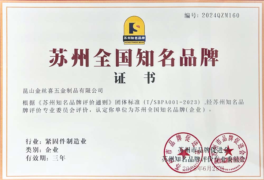 クンシャンジンシクシMetalware Co.、Ltd。は、優れた製品品質、主要な技術強度、包括的なサービスシステム、および広範な市場の影響により、「National Famous Brand in Suzhou」のタイトルを正式に授与されました。